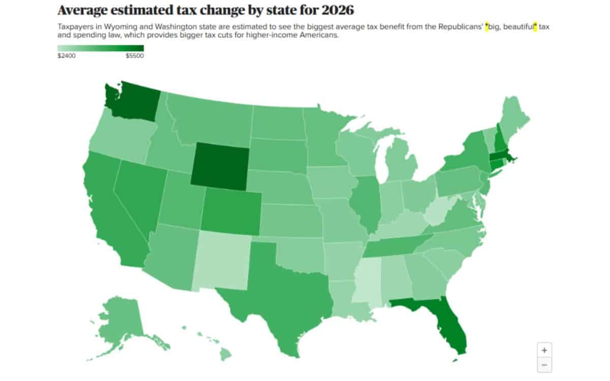 In 2026, the biggest tax cuts will go to states with higher average incomes and larger tax deductions. For instance, Wyoming will see the most substantial tax cut at an average of $5,374. Additionally, residents of states with higher property taxes, like New Jersey and New York, will benefit more due to the increased deduction cap for state and local taxes.