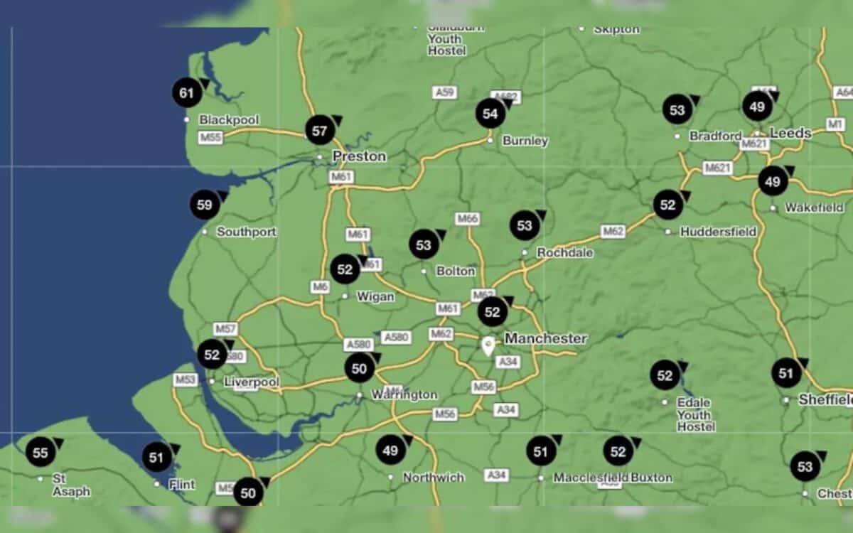 The strongest gusts are forecast along the North West coast, with Blackpool expected to experience winds up to 61mph. Inland cities like Manchester and Liverpool may see gusts around 52–53mph. The top wind speeds currently forecast for the region include: