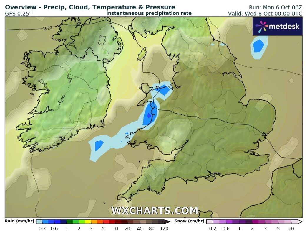 According to WX Charts and Met Desk data, the chill will spread from Inverness to Glasgow, where temperatures are set to fall close to freezing. While most of the UK will experience heavy rainfall, forecasters say Scotland’s higher ground could see the first accumulation of the season, with a couple of centimetres possible in isolated areas.
