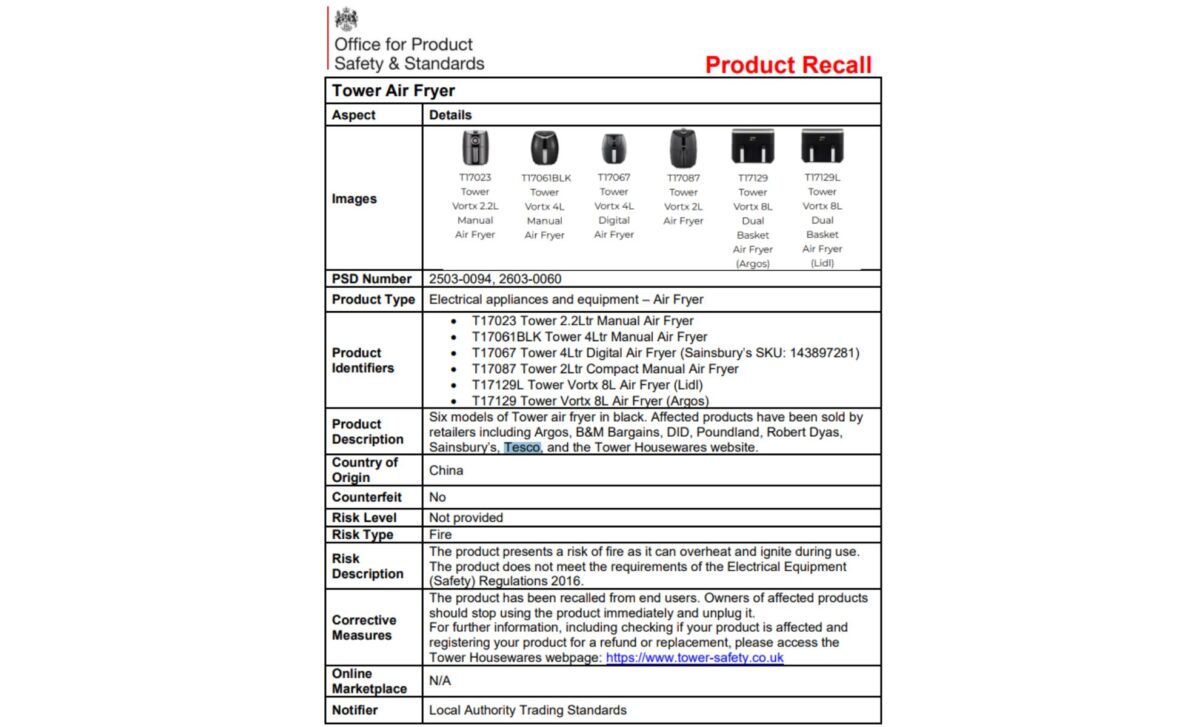 The OPSS has also signposted consumers to the Tower Housewares webpage for full guidance. Anyone in possession of one of the six listed models is urged not to delay, continued use of a faulty air fryer in the home carries a genuine and potentially serious risk of fire.